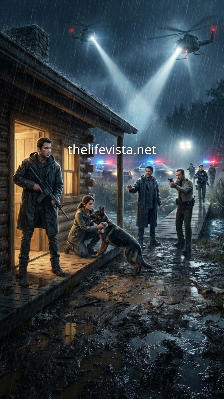 A helicopter’s searchlight tore through the rain like a blade.