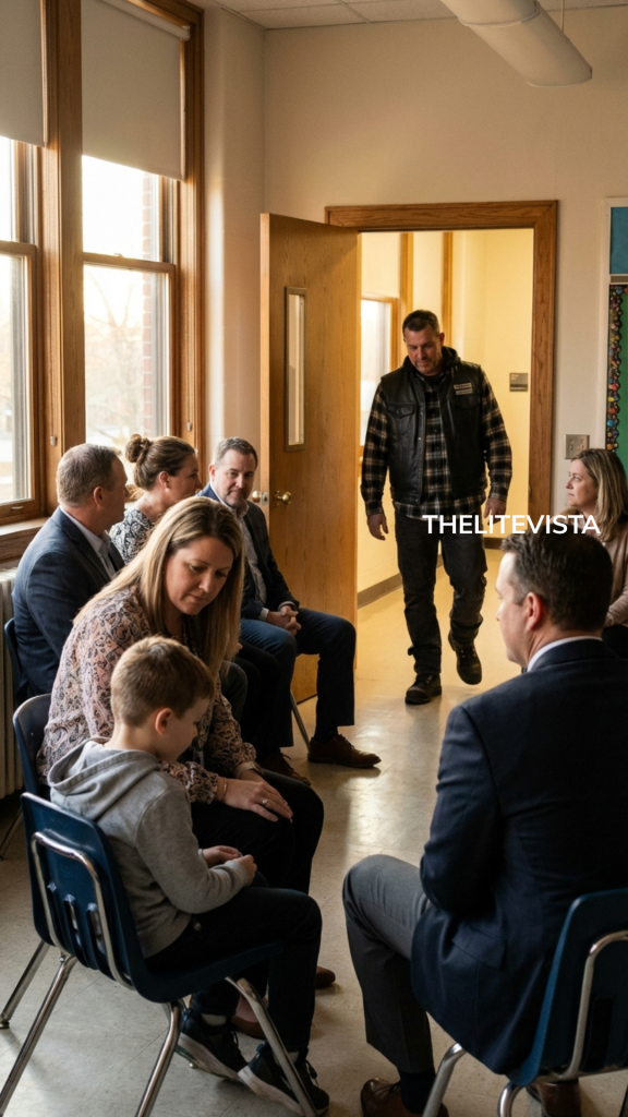 They laughed at the boy in the hallway—until the classroom door opened and a biker walked into the parent meeting.