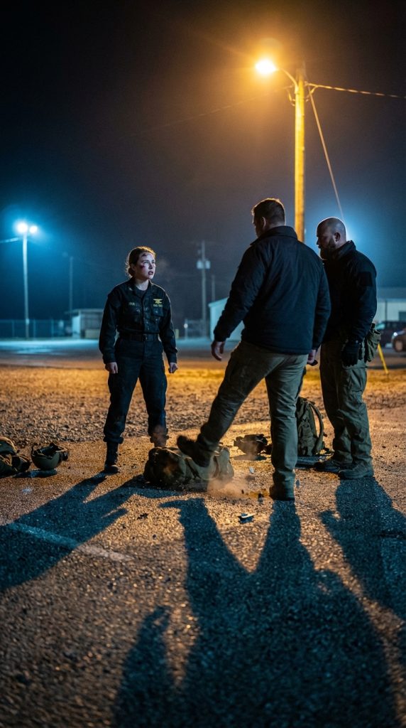 That night, she didn’t go back to her room right away. She stayed in the facility gym, working through mobility drills, keeping her body ready. The room was empty except for her — until it wasn’t. Brian walked in at 2130, then Derek, then Kevin. She didn’t stop stretching. “Need something?” Brian crossed his arms. “Yeah. The truth.” “About what?” “About who you are and why you’re really here.” “I already told you: I’m assigned to ICP.” “Nobody gets assigned to ICP at twenty‑five.” “I did.” “There’s something you’re not telling us.” She stood up slowly. “There’s a lot I’m not telling you, because it’s none of your business.” “It becomes our business when you start making us look incompetent.” “I’m not making you look like anything. You’re doing that on your own.” Kevin stepped forward. “You need to watch your mouth, little girl.” “Or what?” “Or you might find out why they call this a high‑risk training environment.” “Is that a threat?” “It’s a promise.” She looked at all three of them, measured the distance, calculated the angles, assessed the threat level. Then she walked toward the door. Derek stepped in front of it. “We’re not done talking.” “Yes, we are.” “Move when we tell you to move.” “Move or I’ll move you.” He laughed. “You’re going to move me?” “If I have to. Try it.”
