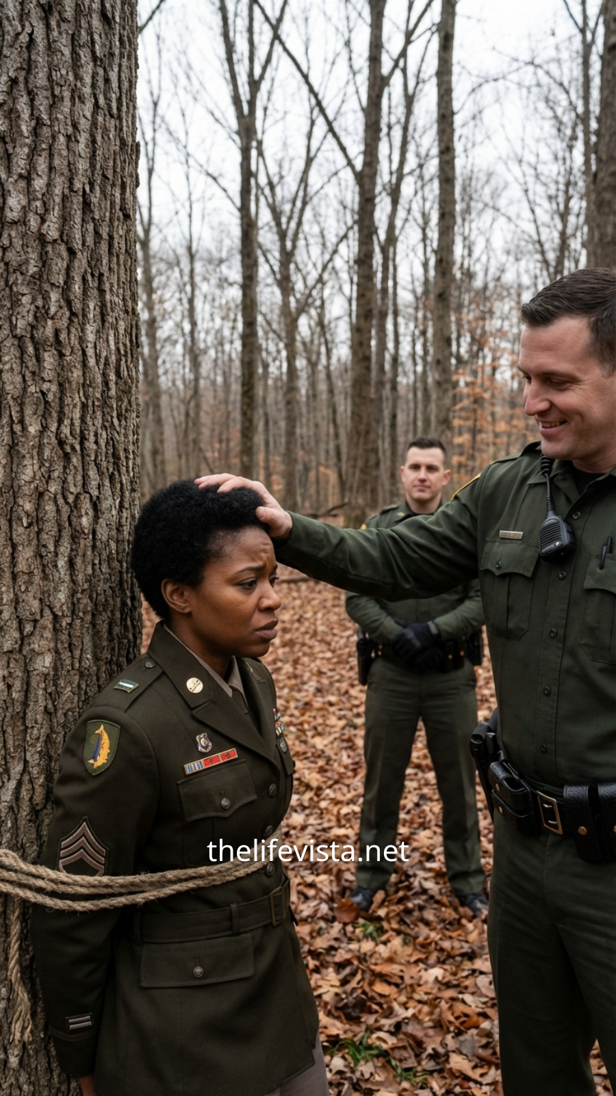 They dragged her twenty feet off the road to a wide oak tree near the ditch line. The bark scraped her back through her coat as they pulled her upright and secured her wrists behind the trunk with another restraint. Mercer stepped away first, breathing hard. Pike kept staring at her as if daring her rank to save her.
