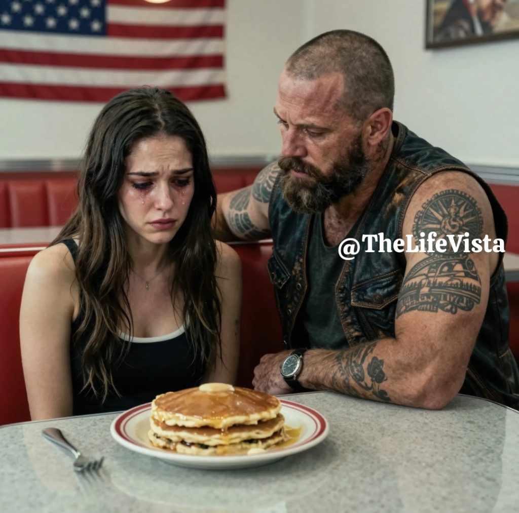 A fresh plate came back, pancakes stacked high, butter melting down the sides, strawberries cut into little hearts by someone who still believed small kindness mattered. The child stared at it like it was magic, then whispered, “Thank you,” and the biker gave her a soft smile. “Eat, sweetheart,” he said, and the mother covered her face as tears slipped between her fingers, the kind of tears that come from being pushed to the edge and then pulled back by a stranger’s decency. The child took a bite and her whole face shifted from fear to relief, and the room warmed back up, conversations returning in cautious waves, while even strangers smiled like they’d been reminded of something they were in danger of forgetting.