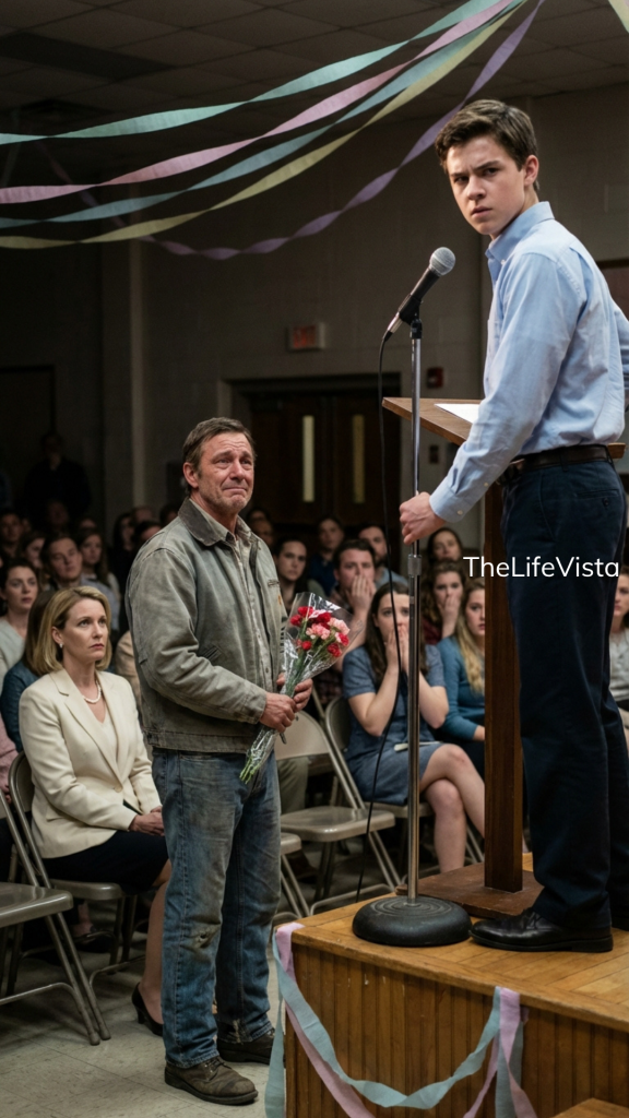 He adjusted the plastic around the flowers. He glanced once toward the stage, where **Ethan Walker** stood with the other honor students, posture straight, shirt crisp, hands clasped behind his back.