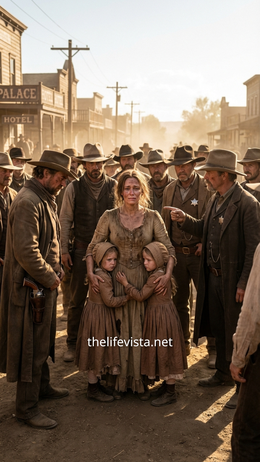 Perhaps he had only come for feed or tack. Perhaps he had stumbled into the scene by chance. But there he was, hat low over his brow, jaw tight, taking in the sight of his daughters wrapped around the woman the town was trying to drive away like a stray dog. Ava ran to him, seized his hand, and pulled him forward. “Papa, make them stop.”