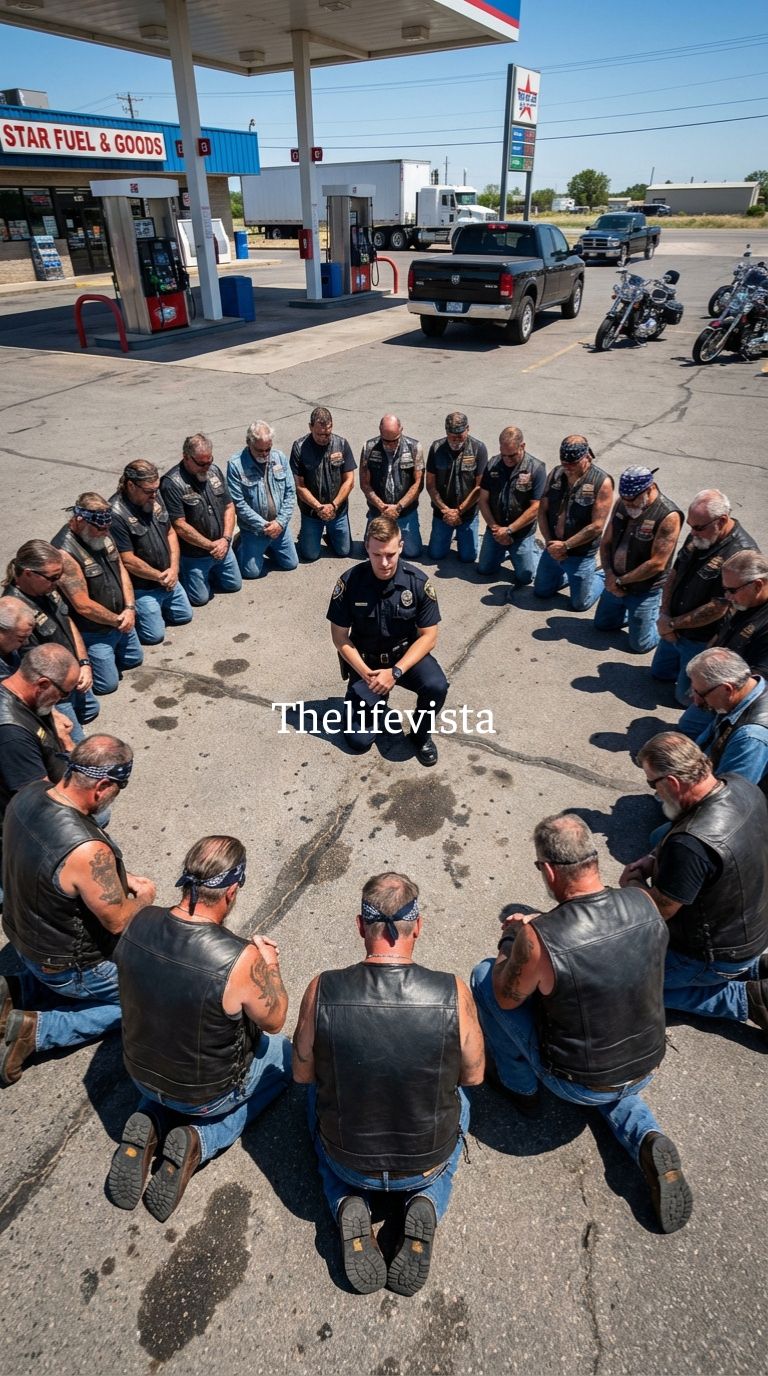 Thirty men—tattooed, weathered, imposing—knelt in synchronized silence around a single young police officer who had been bracing for conflict.