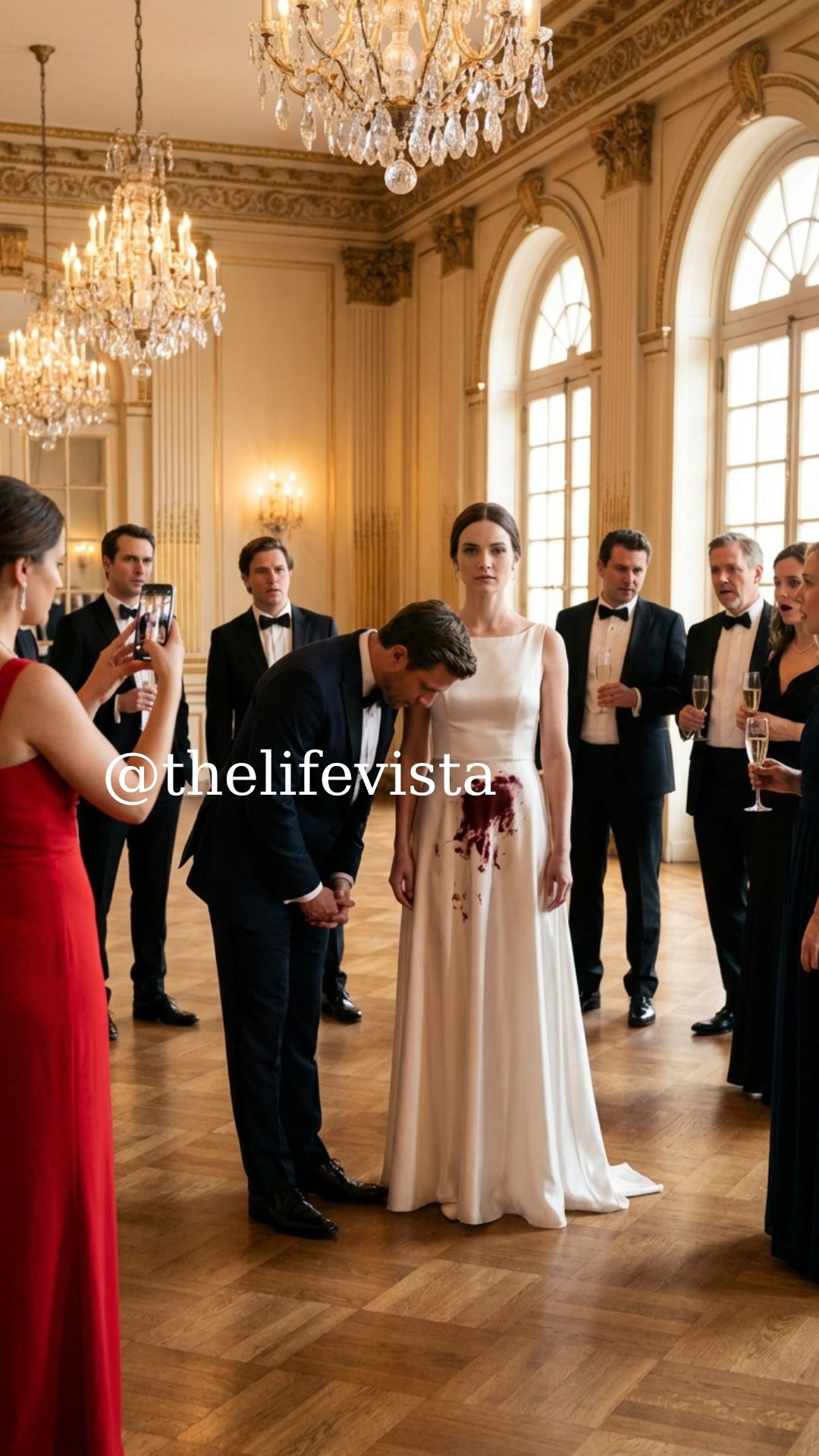 A waiter pivoted too quickly, elbow catching a glass. Red wine arced through the air and splashed across Madison’s scarlet dress—dark, spreading, unmistakable.