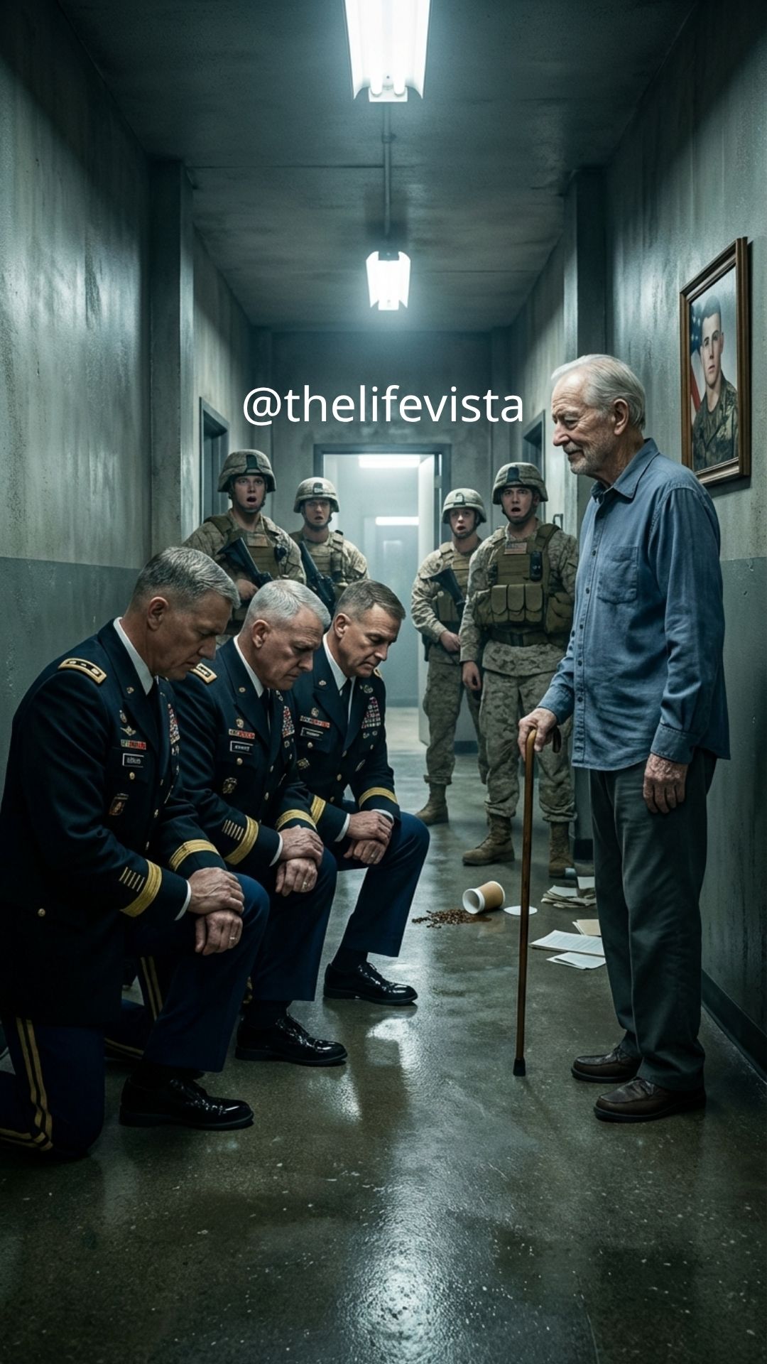 Thirty yards away, a set of heavy double doors hissed open. A female specialist stepped into the hallway, balancing a tray of coffees in both hands. Her eyes drifted toward the confrontation: three towering Marines surrounding a solitary old man, with white papers scattered across the floor like a surrendered flag.