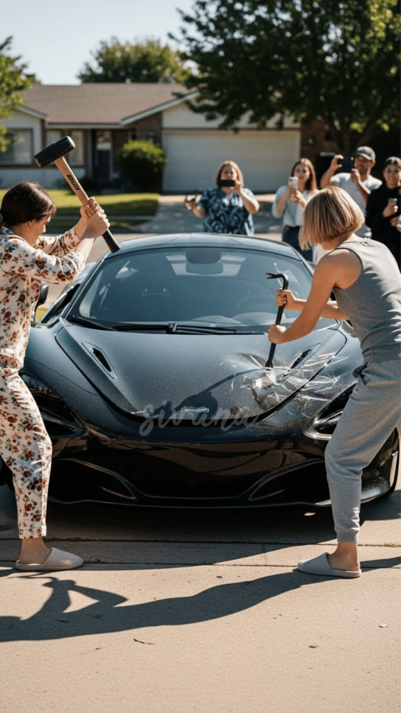 The shriek of shattering glass echoed down the quiet suburban street, followed by the unmistakable metallic crunch of something very expensive being crushed. I froze at the end of the block, groceries still dangling from my hands, heart jackhammering in my chest. The sun glared off the jagged windshield of my McLaren 720S like it was winking at me in mockery.