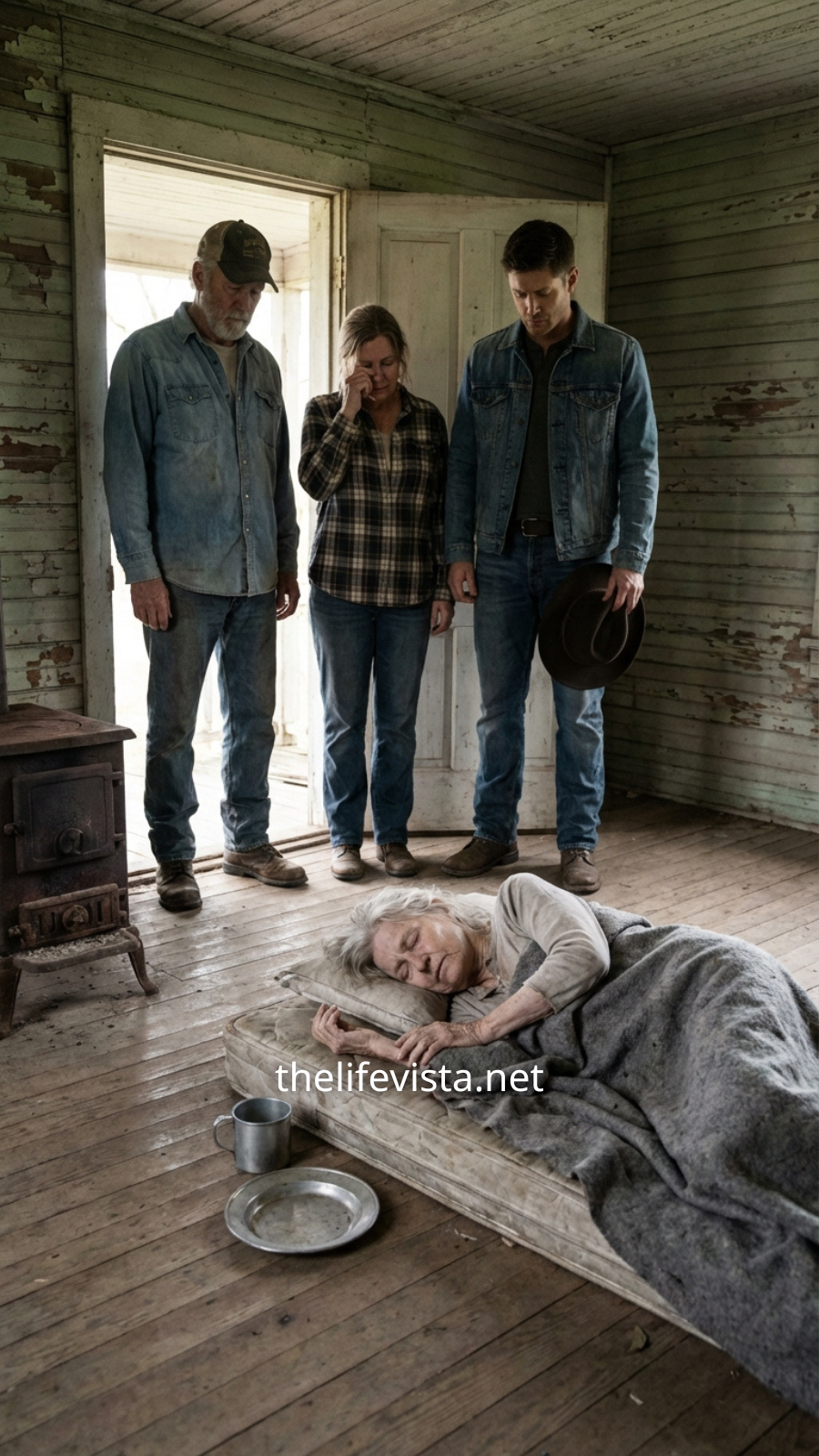We stepped inside. The wooden floor groaned beneath our feet. A single dim bulb flickered overhead. And there she was—sitting on a thin mat on the floor, frailer than we had ever seen her, her hands trembling as she tried to stand.