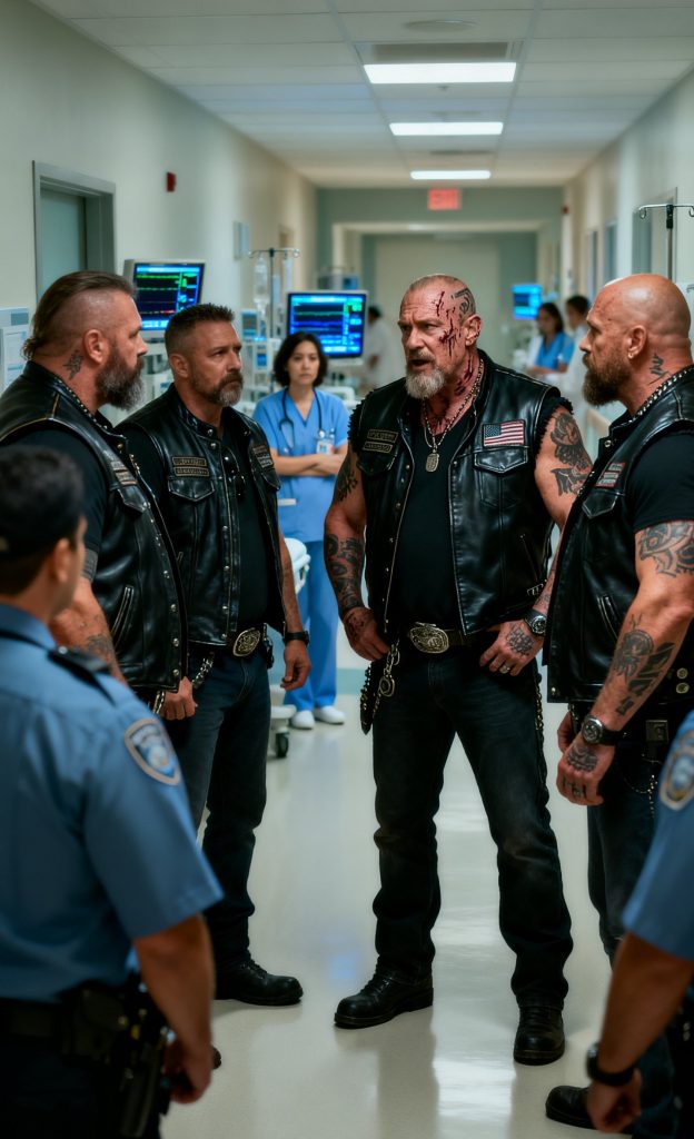 The alarms hadn’t even finished echoing when the elevator doors slammed open on the third floor, and the air itself seemed to tense. Four massive men stepped out like they owned the building, boots heavy against the tile, leather vests creaking with every stride. Their presence filled the hallway before a single word was spoken, and every nurse, every patient, every monitor seemed to pause in uneasy anticipation.