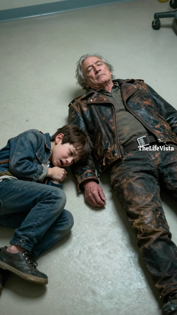 Later that night, after he finally fell asleep, I stood in the kitchen and cried. It was not the hot embarrassed crying I had done on the clinic floor, and it was not the exhausted crying that comes when a day has simply taken too much. It was relief, pure and overwhelming. Sometimes strength does not arrive with speeches or explanations. Sometimes it comes in the form of a weathered old man in a leather jacket lying down on dirty tile so a frightened child does not have to face the world alone.