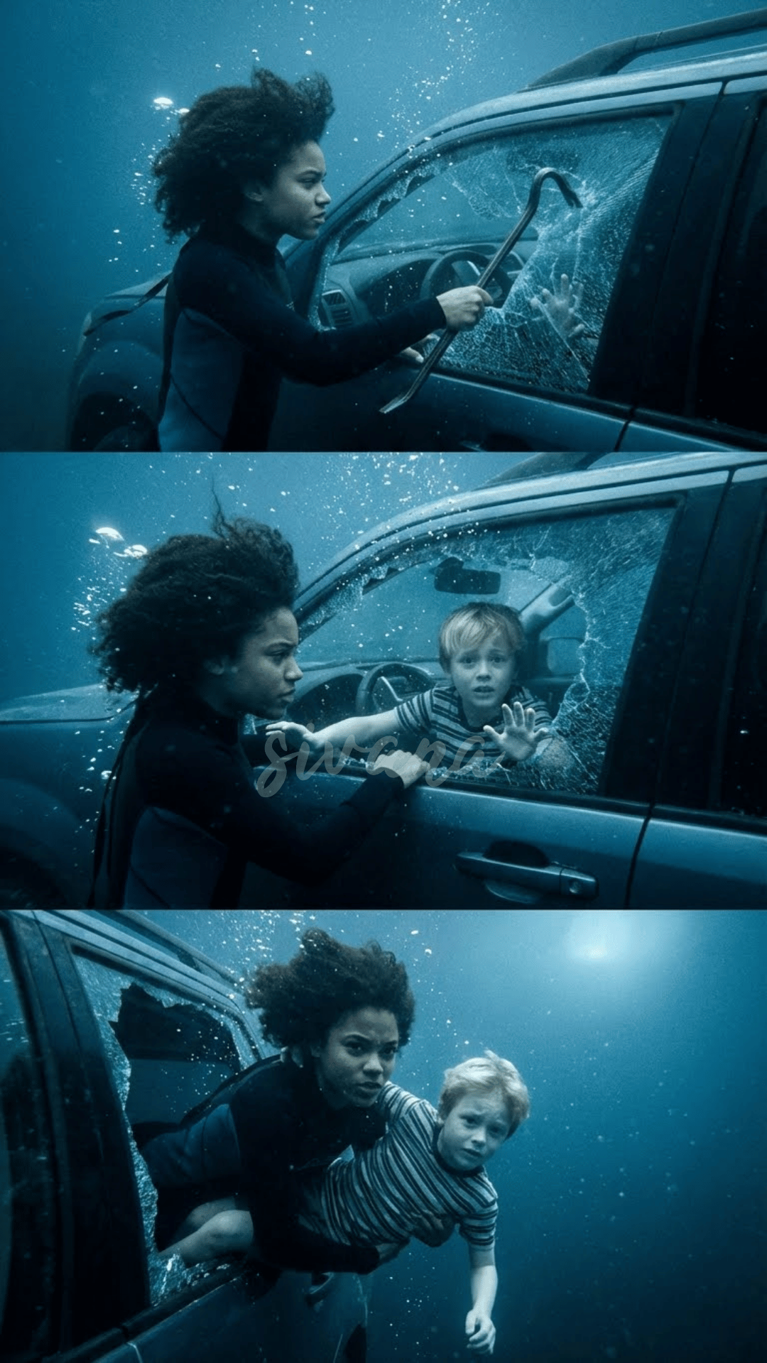 The freezing water slammed into her, nearly robbing her of breath. She forced her arms forward, fighting toward the SUV as it sank deeper. Her hands went numb. Her lungs burned. Through the shattered surface, she saw a small face pressed against the glass — a terrified boy with blond hair floating around him like a halo.