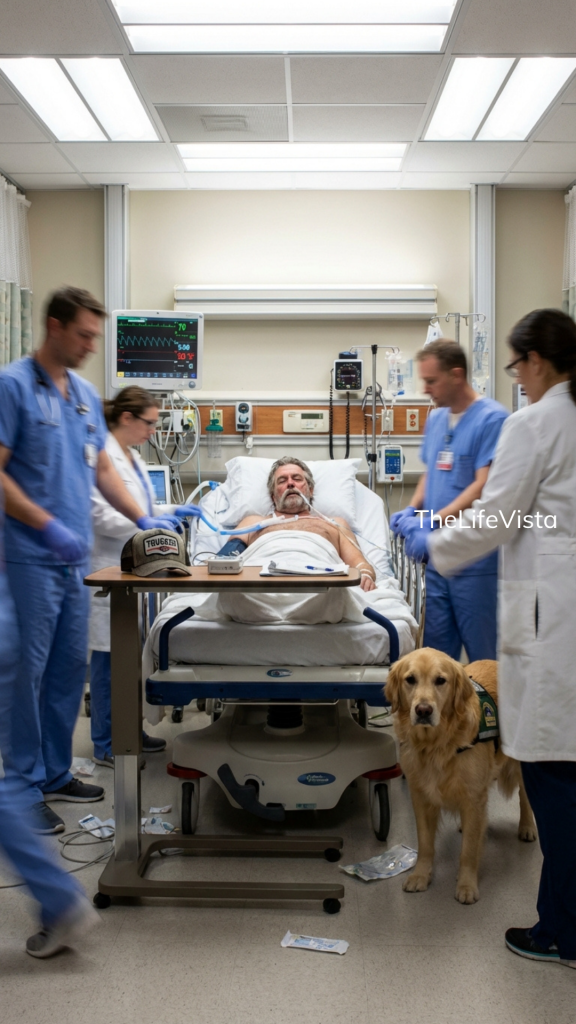 The ICU doors flew open. A gurney came through at the kind of speed that tells you everything before anyone speaks. Behind it, awkward in the middle of that sterile rush, a golden retriever slipped through the confusion as if he knew he was somewhere he did not belong but had no choice except to follow.