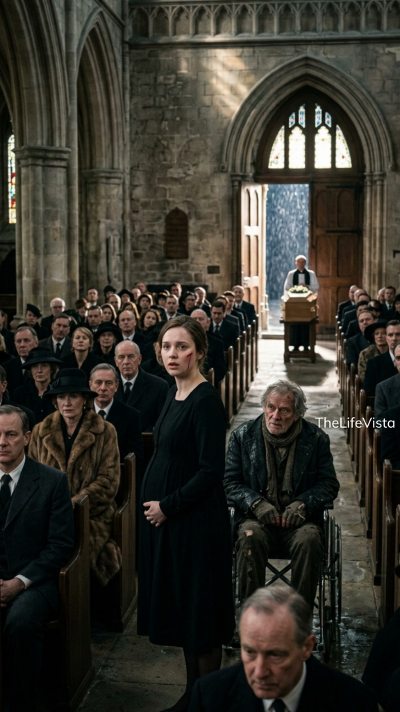 She was kneeling beside her father’s casket, whispering goodbye to the only man who ever loved her, when she saw him: an old man in a torn jacket, sitting in a wheelchair in the pouring rain, struggling to open the church door. Two hundred people were in that church. Not one of them moved. Not one of them cared. So Nora Ashford stood up. She walked past her stepmother’s glare, past every person who pretended not to see, and she opened that door. She wheeled him inside. She took off her own coat and draped it over his shaking shoulders, and that is when her stepmother slapped her across the face in front of everyone at her own father’s funeral. The sound echoed off the stone walls. Blood ran down her cheek. Two hundred people watched. Nobody said a word.