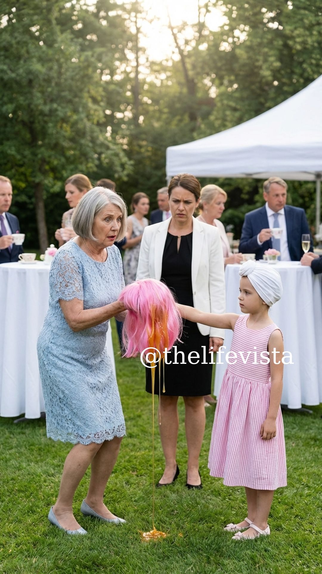 The next afternoon, the backyard was filled with neatly trimmed hedges, matching tablecloths, and perfectly plated cucumber sandwiches. Carol floated from guest to guest like the queen bee she believed she was, wearing the only unshrunk dress left—a pale blue lace one-piece.