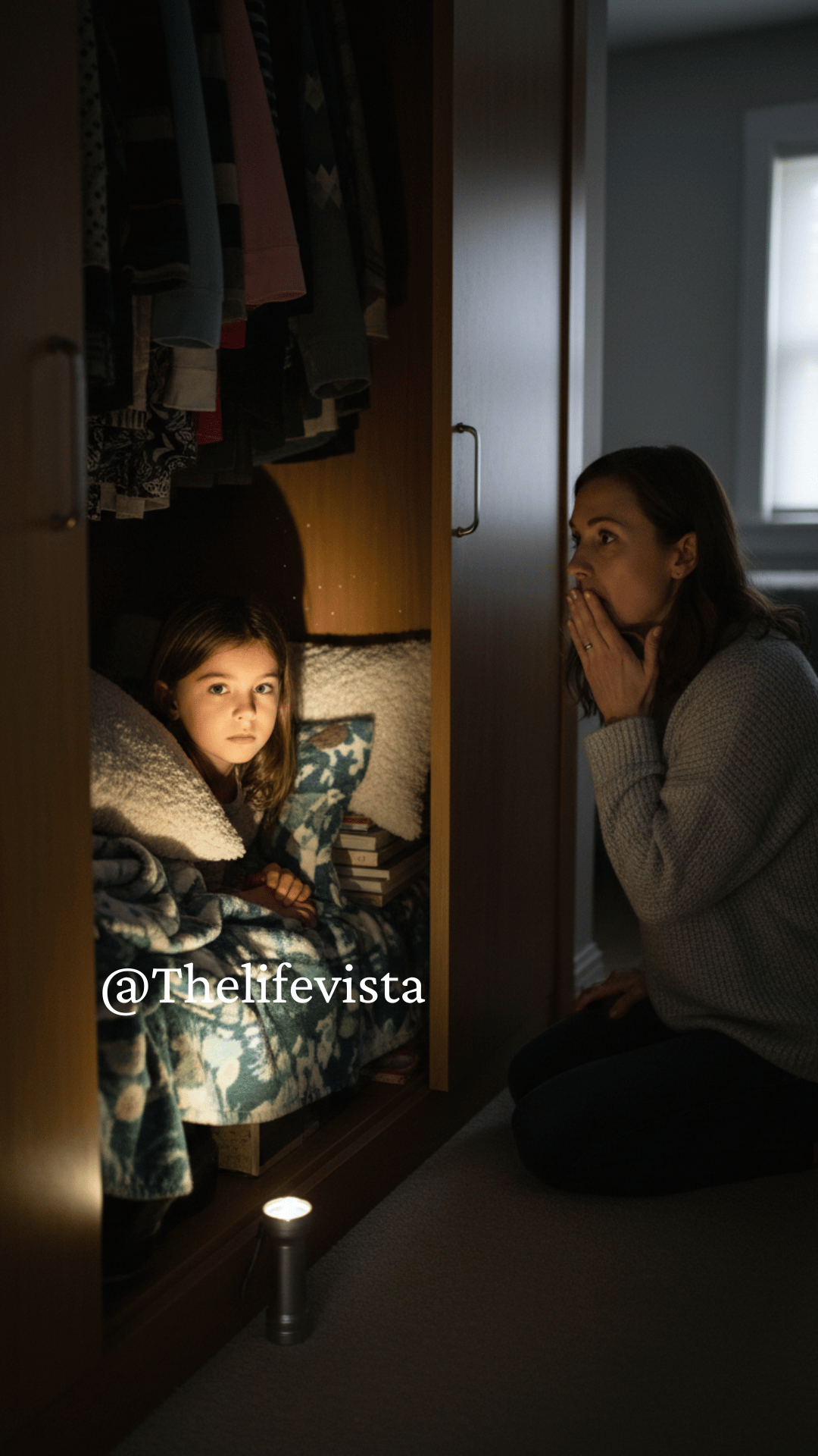 As bedtime approached, Emma didn’t go to her bed. Instead, she walked to her closet, slid the door open, and revealed a secret that stopped my heart. Inside, nestled among the hanging winter coats and shoe boxes, was a fully prepared sleeping nest. A thick duvet, a pillow, and a flashlight were arranged with practiced precision.