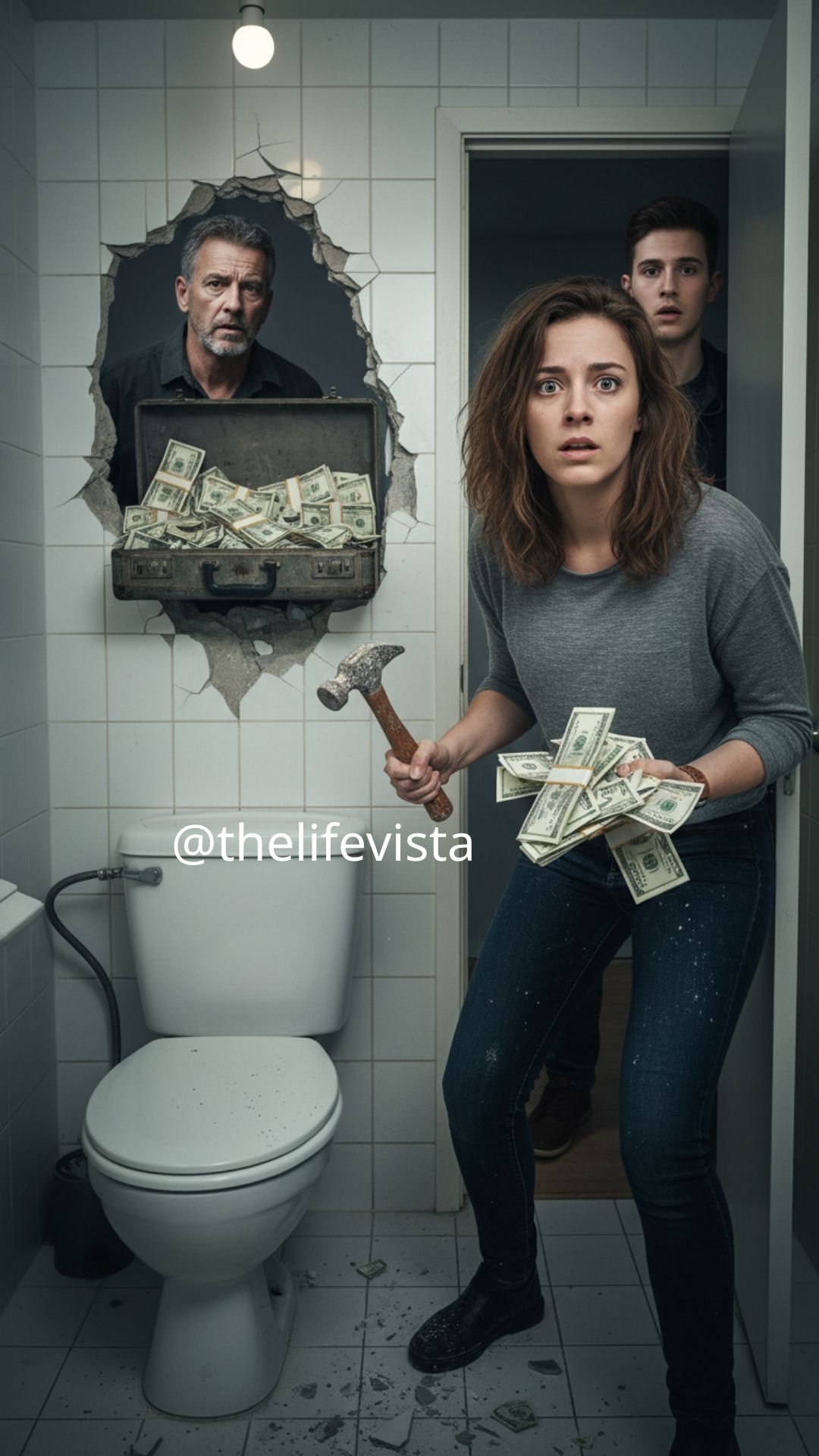 While my husband was out, my father-in-law whispered, “Take a hammer. Break the tile behind the toilet—now.” My hands shook as the ceramic cracked, dust filling the air and sticking to the damp skin on my wrists like the house itself was trying to hold me in place. Behind it, a dark hole appeared, and for a second my brain refused to give meaning to what my eyes were seeing because meaning would change everything. I froze. “Oh my God… what is that?” I gasped, and the sound came out thin, like my voice didn’t belong to me anymore. He didn’t answer. He just looked at me and said, “You weren’t supposed to find this,” and the way he said it made my stomach drop because it sounded less like a warning and more like a confession he’d been carrying for years.
