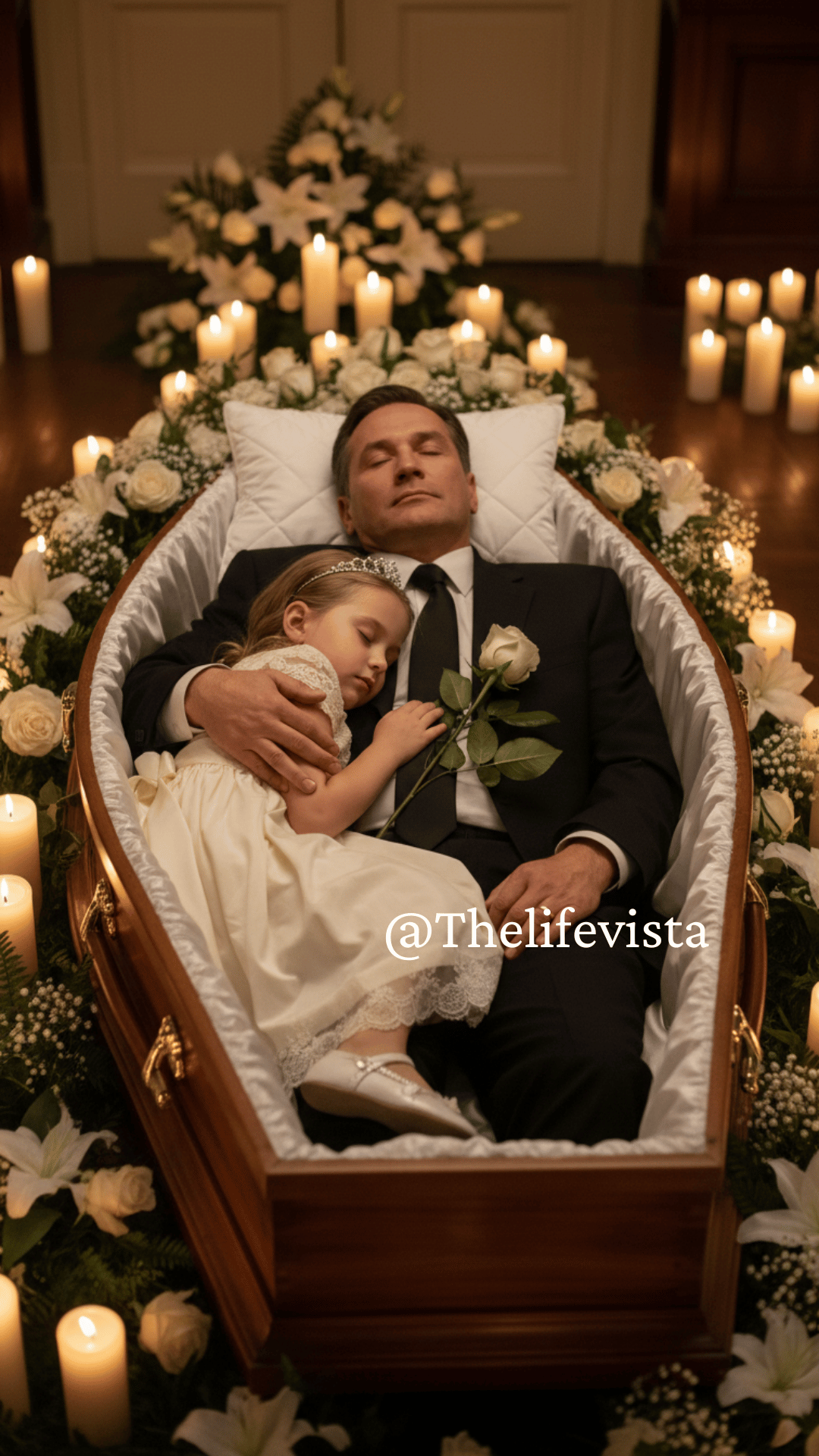 Inside, the hall was dark except for the glow of candles around Dad’s coffin. And there—lying beside him, her little head resting on his chest—was Mia. Her eyes were open but calm, her fingers clutching his sleeve.