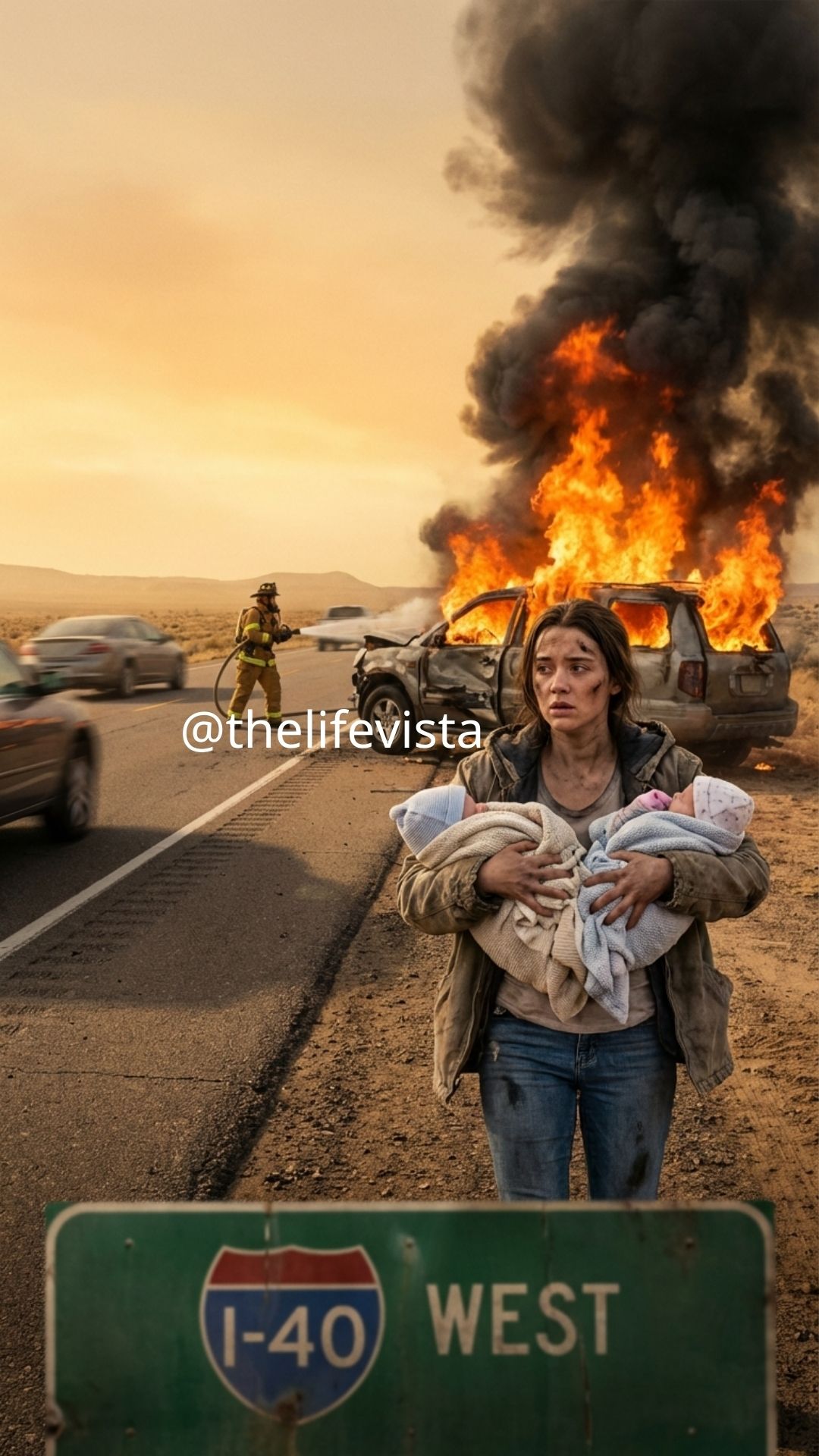 For one stunned second I stared at the screen, hearing only the dead tone—until the fire behind me grew loud, a crackle turning into a roar, and that abrupt shift from disbelief to emergency felt like getting shoved from one life into another without warning. I called 911, gave my mile marker through shaking breaths, and wrapped my arms around my babies as they screamed into my shirt, while the shoulder of the highway stretched around us with that terrible empty vastness that makes danger feel even larger because there is nowhere to hide from it.