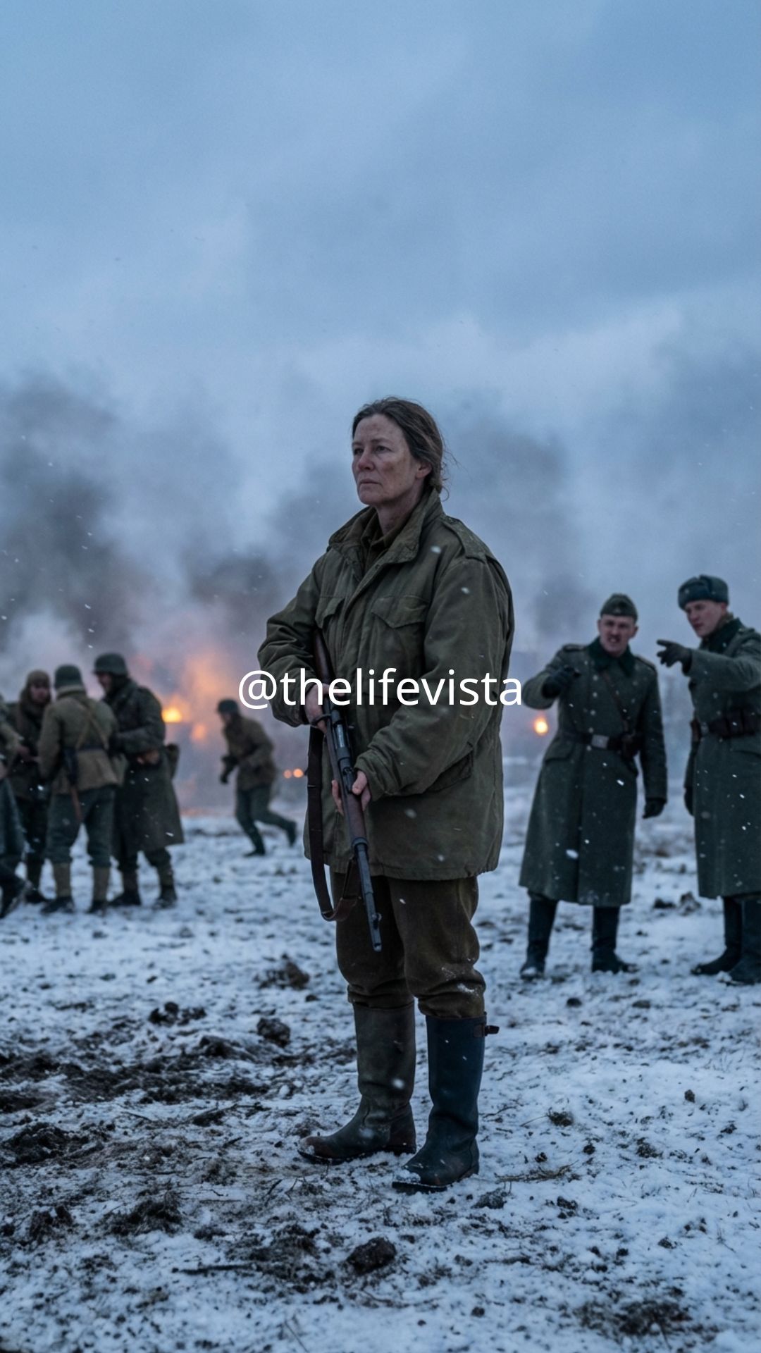 She stood outside in it, not moving, not shivering, just standing there in the white, wearing a field jacket two sizes too large and boots that didn’t match — left foot standard army issue, right foot something older, something that had been resold at least twice. No pack, no visible weapon, no insignia.