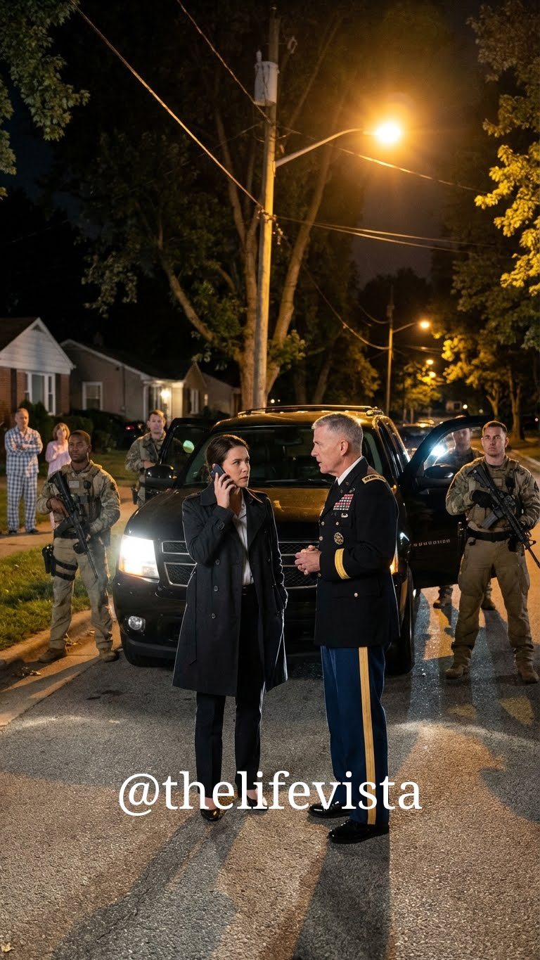 Three matte-black Chevrolet Suburbans rolled silently onto Maple Ridge Drive just after sunset, their engines humming low and deliberate. The quiet suburban street froze. Porch lights flicked on. Curtains shifted. Men in plain clothes stepped out first, scanning rooftops and windows, hands near concealed weapons. This was not a police visit. This was national security.