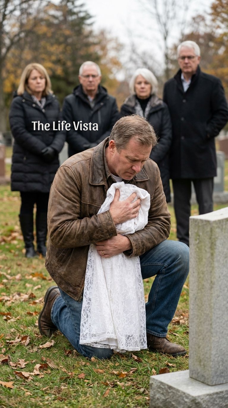 It was cradled with extraordinary care, the lace sleeves draped over his rough hands while he held the fabric close to his chest. From a distance, the sight looked unsettling. A lone biker in a cemetery, rocking slightly back and forth while clutching a bridal gown beneath a sky that seemed far too beautiful for grief.