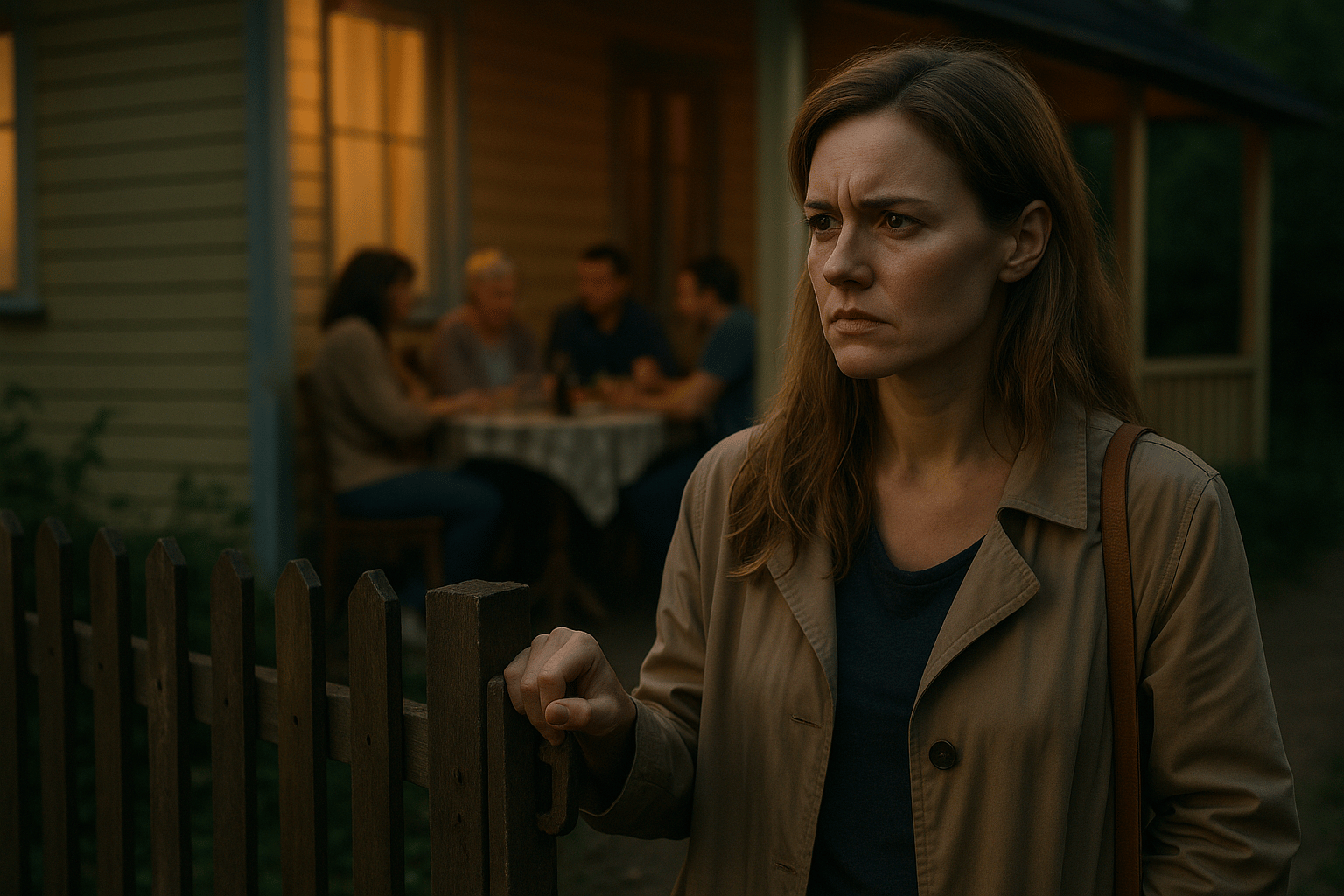 The hum of voices drifted toward her as she approached the house. Laughter, clinking dishes, the creak of the old veranda steps. She slowed down at the gate, smiling. But then she heard her name.