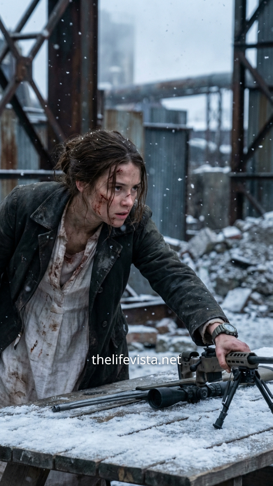 The recoil slammed into her shoulder. The round cut through snow, wind, and darkness.