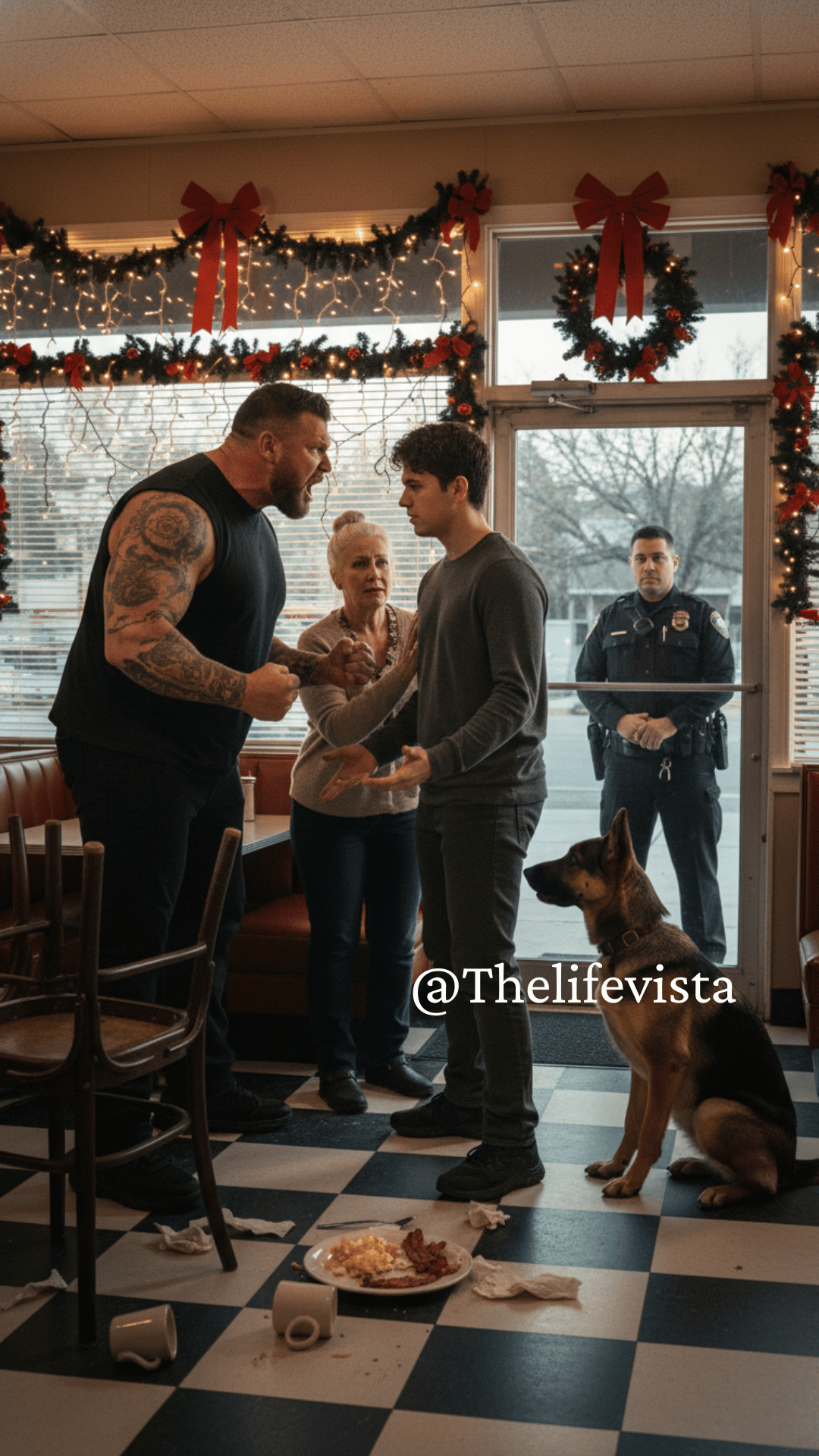The diner seemed to shrink under the weight of tension. Every patron’s eyes darted between Ethan Moore, the towering aggressor, Clara Williams, the calm widow, and Owen Williams, her son, standing like a coiled spring with his Belgian Malinois at his side.