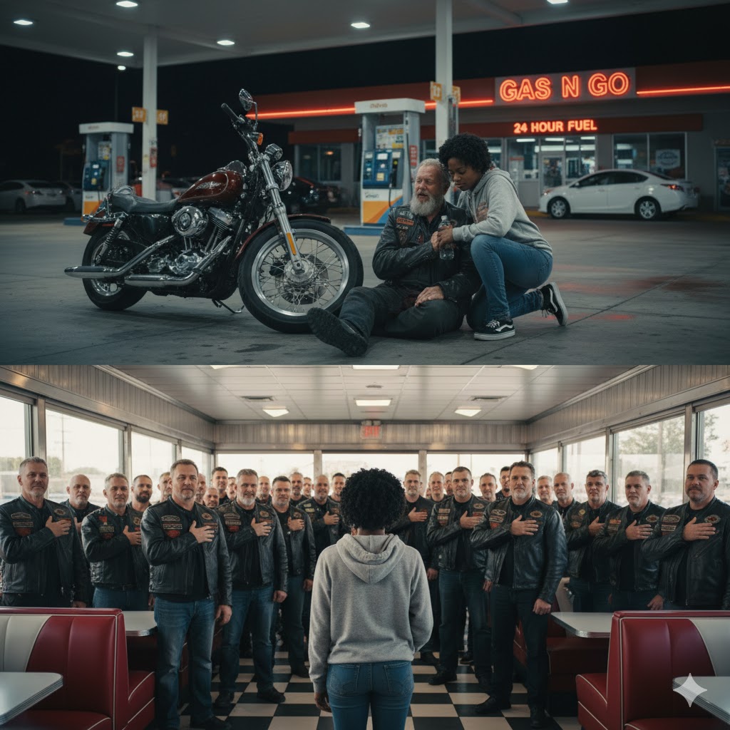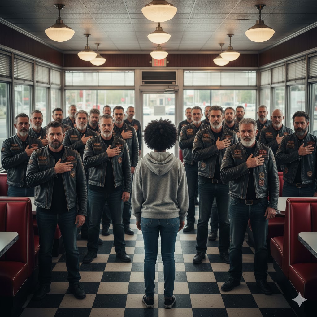 When she arrived, motorcycles lined the street — chrome, leather, thunder. Inside the diner, a hundred bikers sat in silence. All eyes turned toward her.