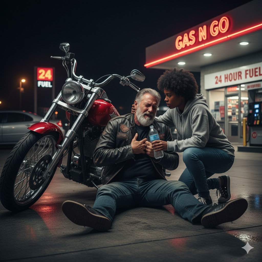 Then she heard it — a raw, choking gasp. Turning, she saw a huge man collapse beside his motorcycle. His face drained of color, his hand clutching his chest.
