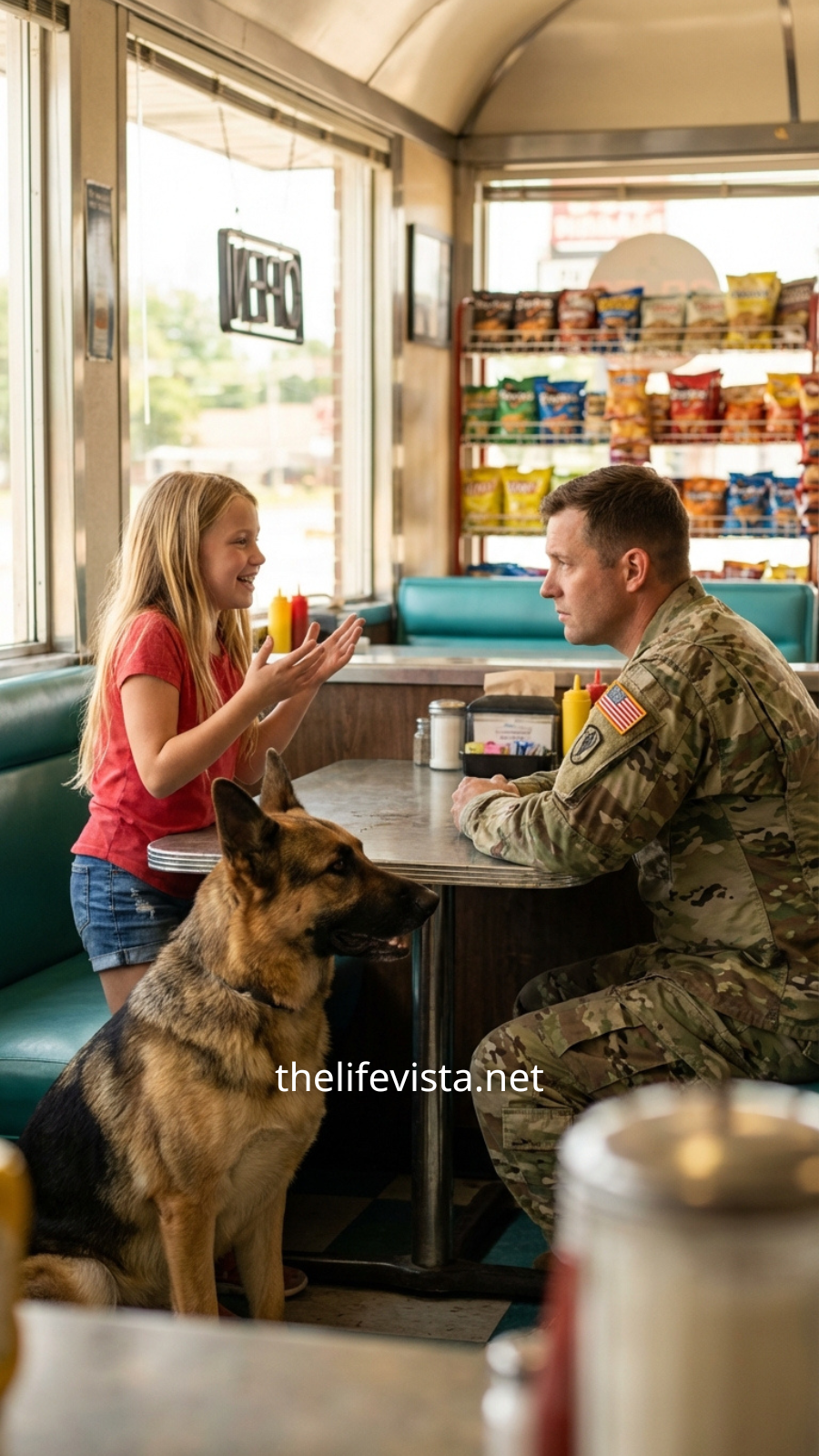 That was when the diner door creaked open, and a small voice cut through the low murmur of the room.